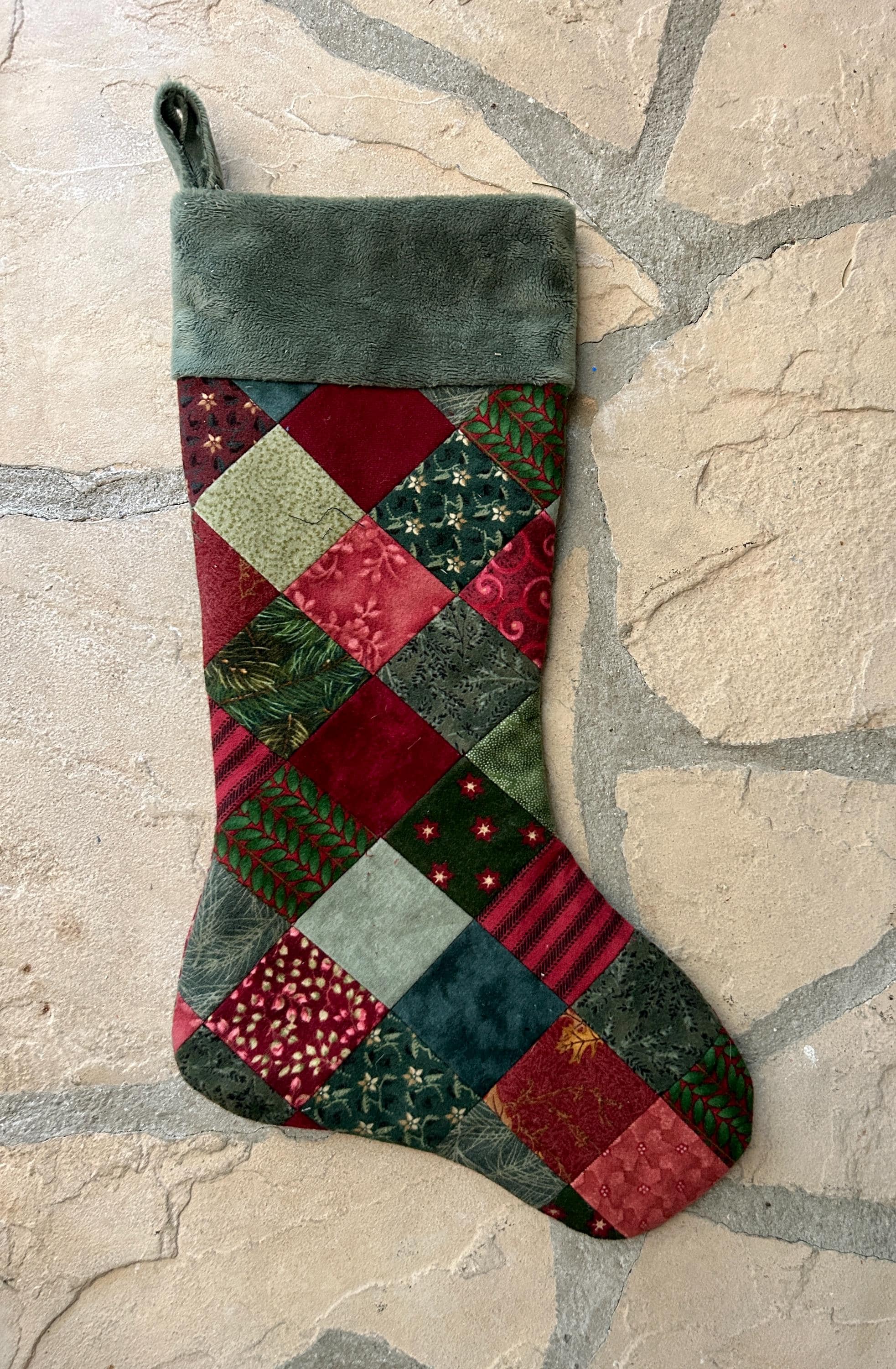 Bring warmth and charm to your holiday season with this handmade patchwork Christmas stocking, lovingly crafted from a curated mix of festive fabrics. Each stocking is one-of-a-kind, featuring a beautiful blend of colors and patterns that capture the magic of a homespun Christmas.