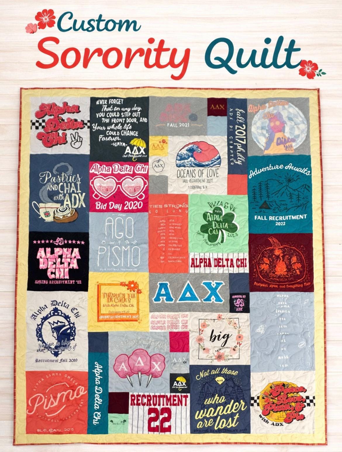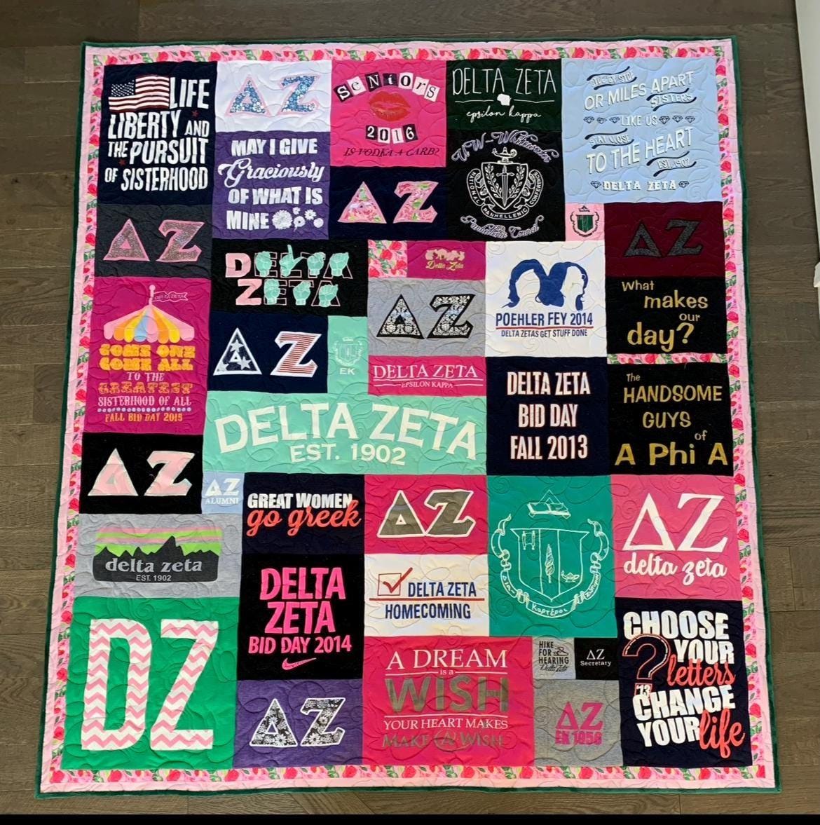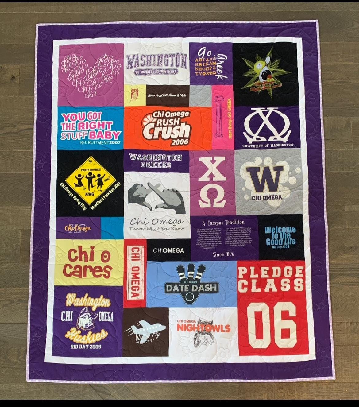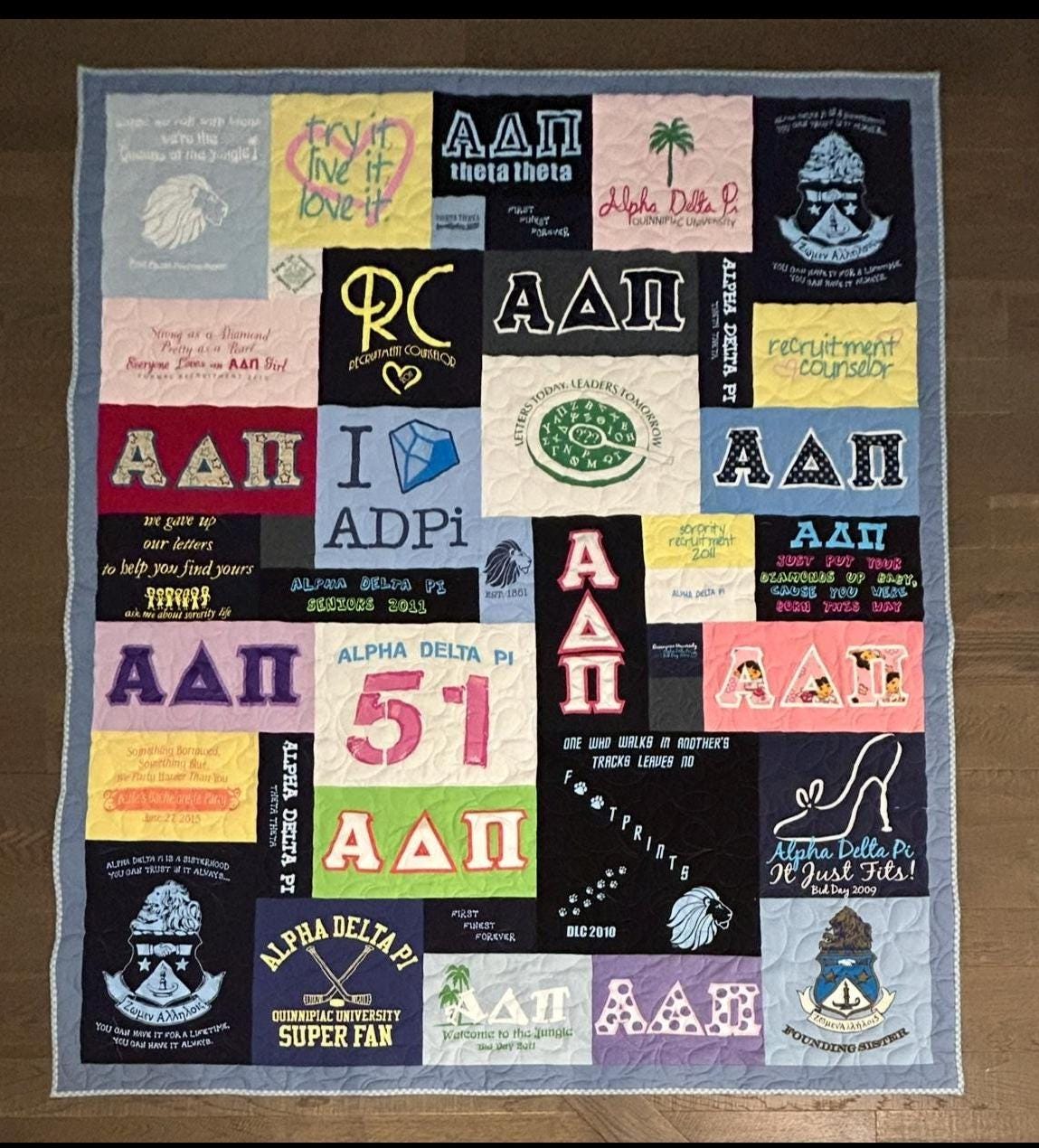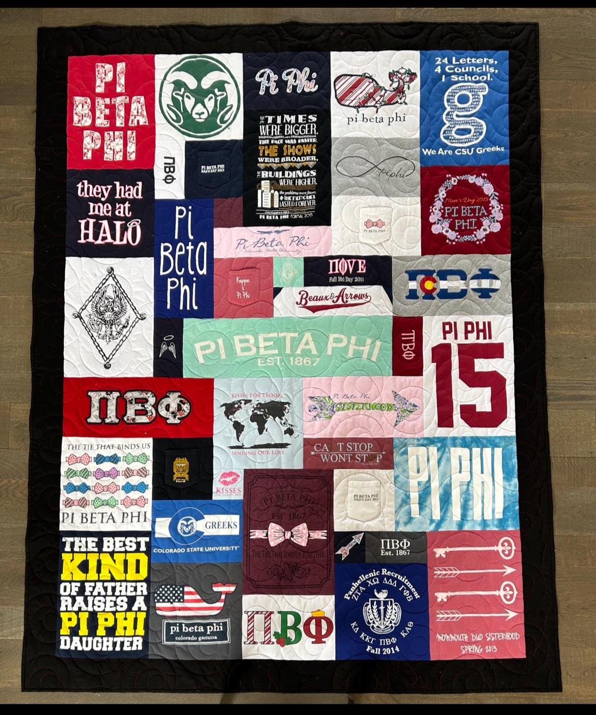 Turn your collection of sorority shirts into a one-of-a-kind keepsake with a custom handmade quilt that preserves your memories in a beautiful, functional way. Each quilt is thoughtfully designed to showcase your journey through Greek life.