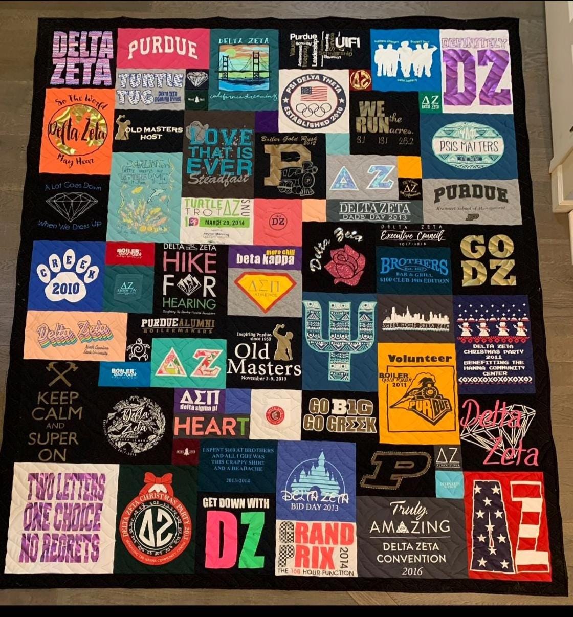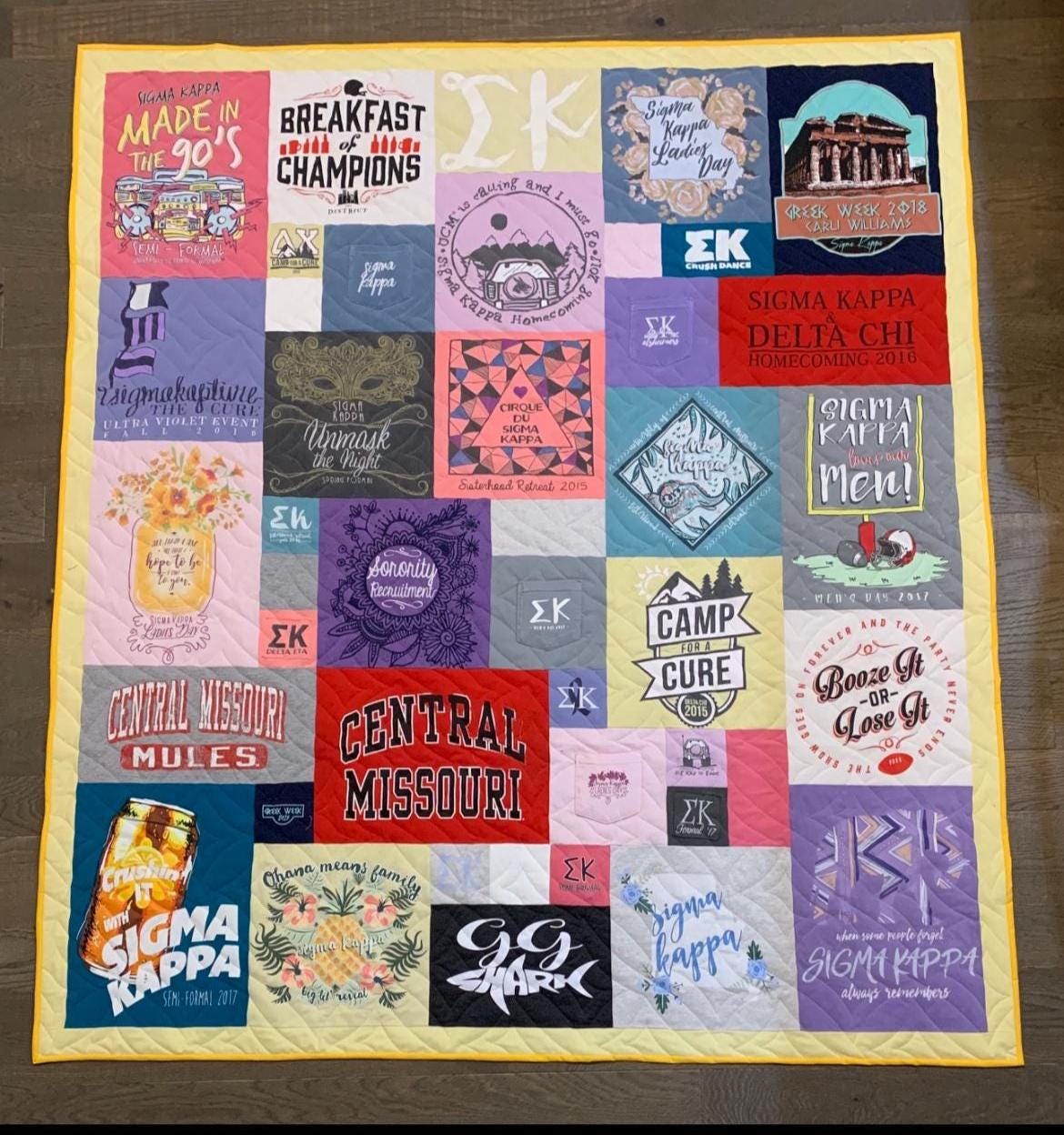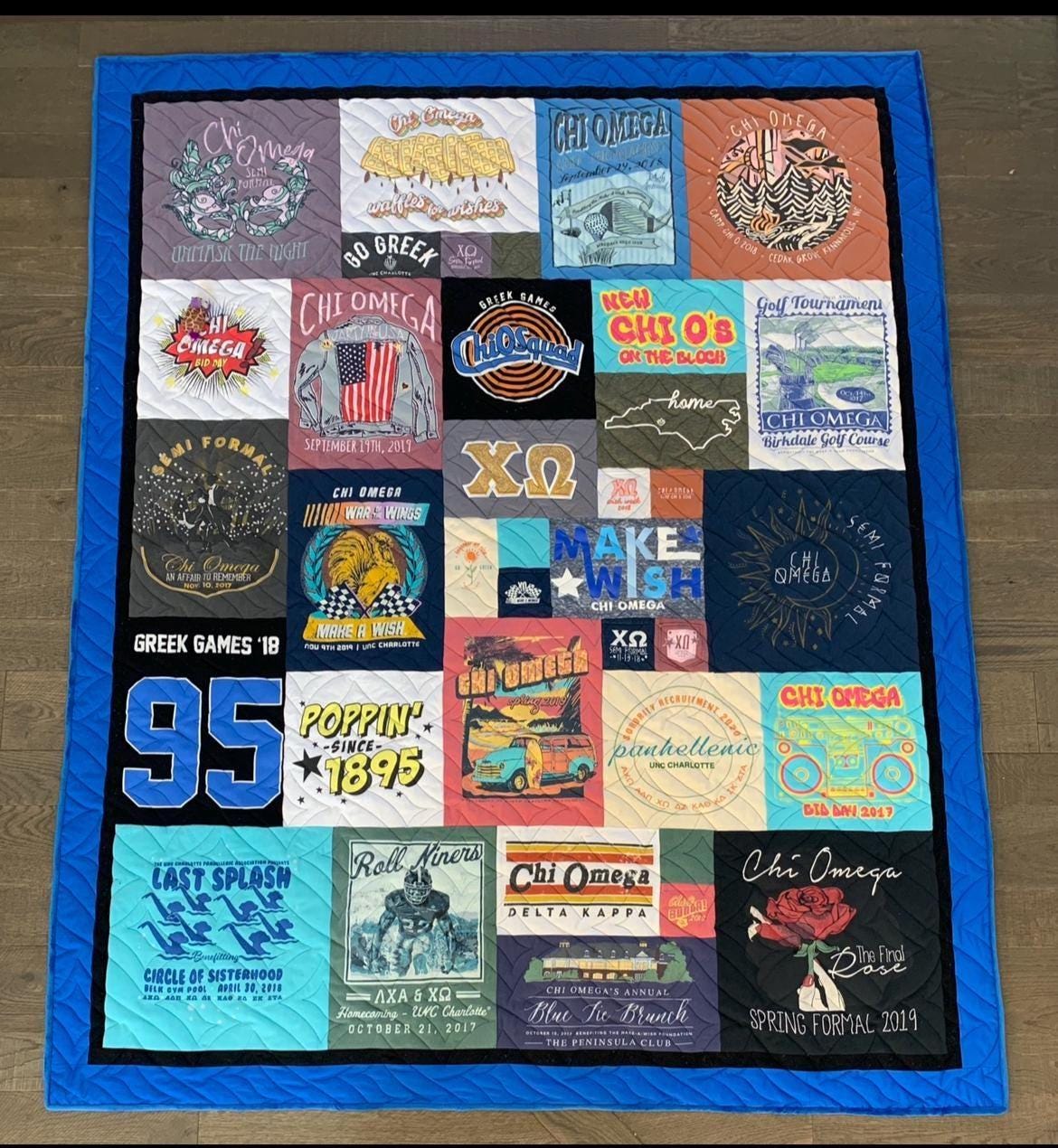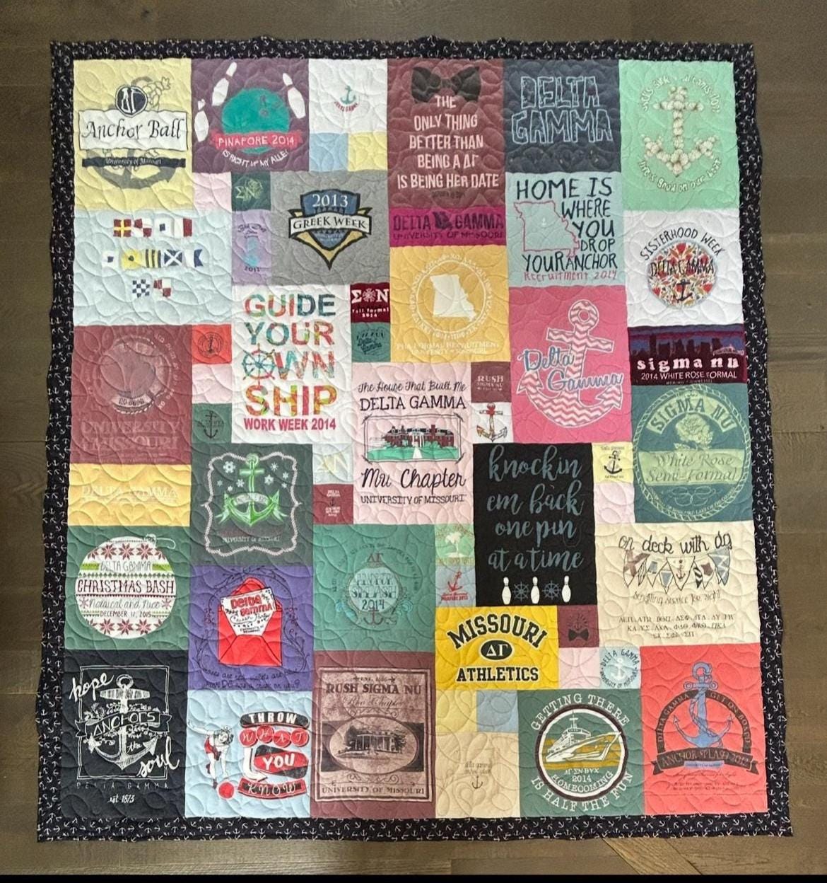 This custom sorority t-shirt quilt is made using your own shirts, including bid day tees, philanthropy events, formals, retreats, and everyday sisterhood moments. Each quilt is fully handmade and crafted with attention to detail. The result is a soft, cozy quilt that's perfect for displaying on a bed, dorm room, or couch while keeping your memories close.