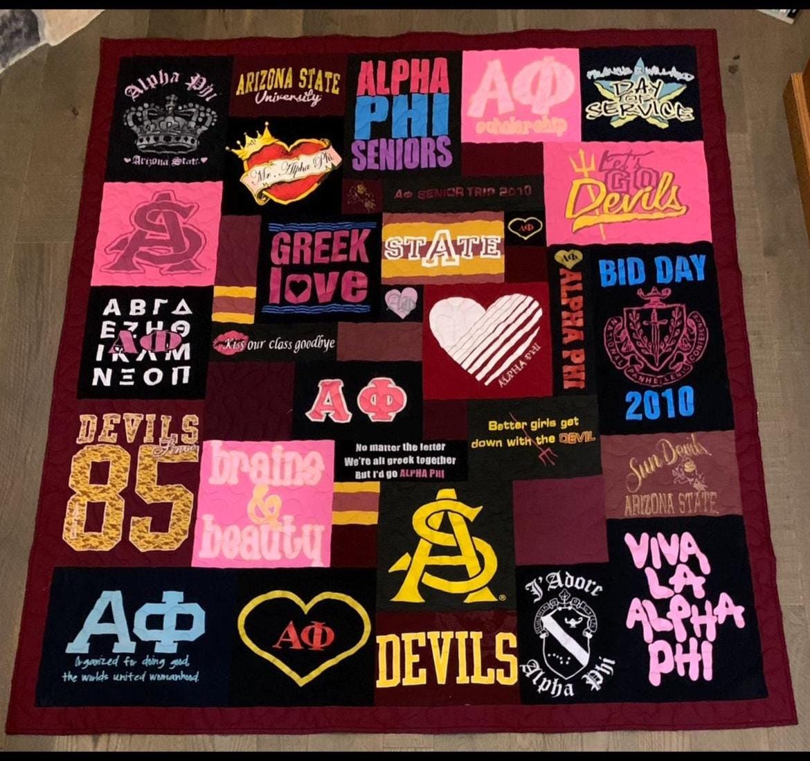 * Handmade from your personal sorority T-shirts, sweatshirts, or memorabilia