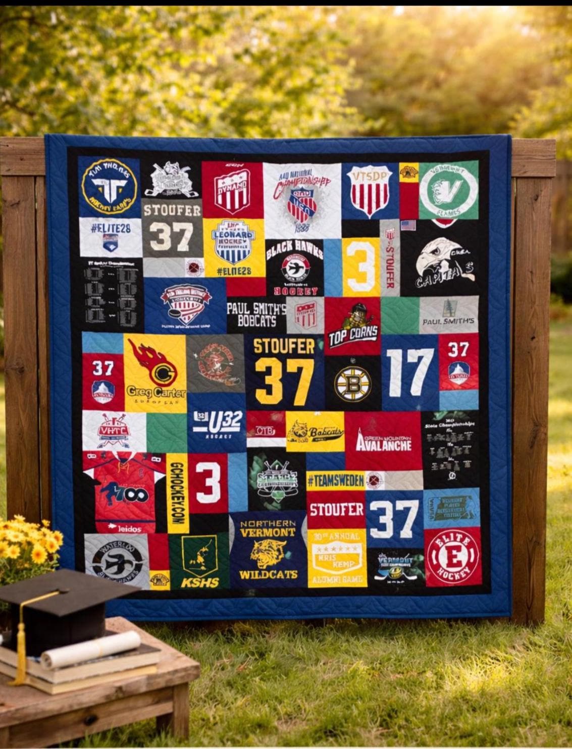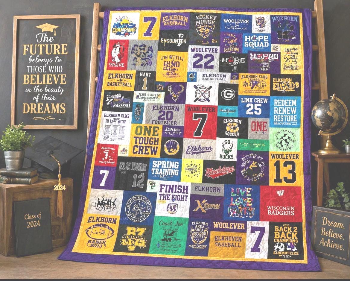 Celebrate a milestone in the most meaningful way with a custom graduation T-shirt quilt—designed to turn cherished memories into a one-of-a-kind keepsake. This quilt beautifully showcases a graduate’s journey, featuring a collection of favorite shirts, photos, and moments that tell their unique story.